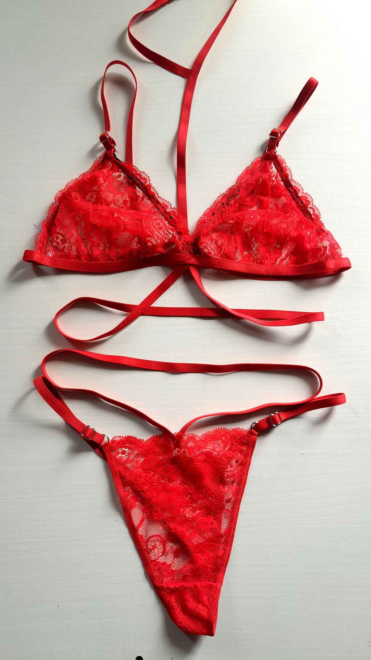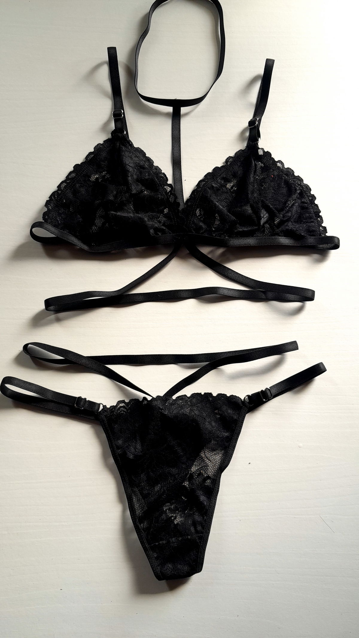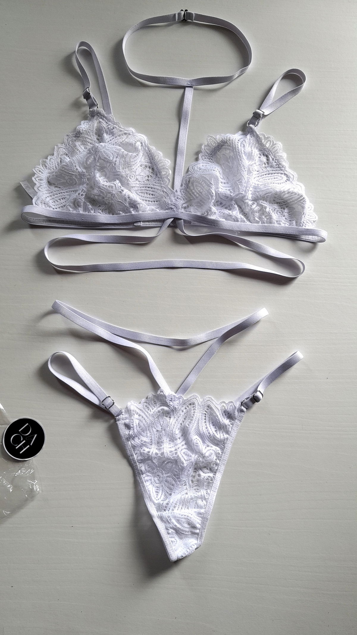 Conjunto con arnes y less con tiras dobles.