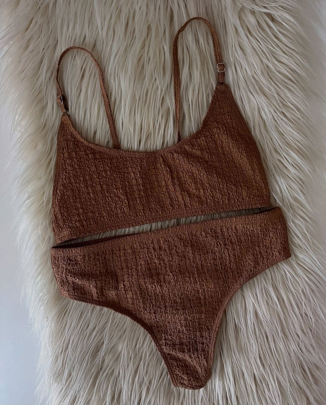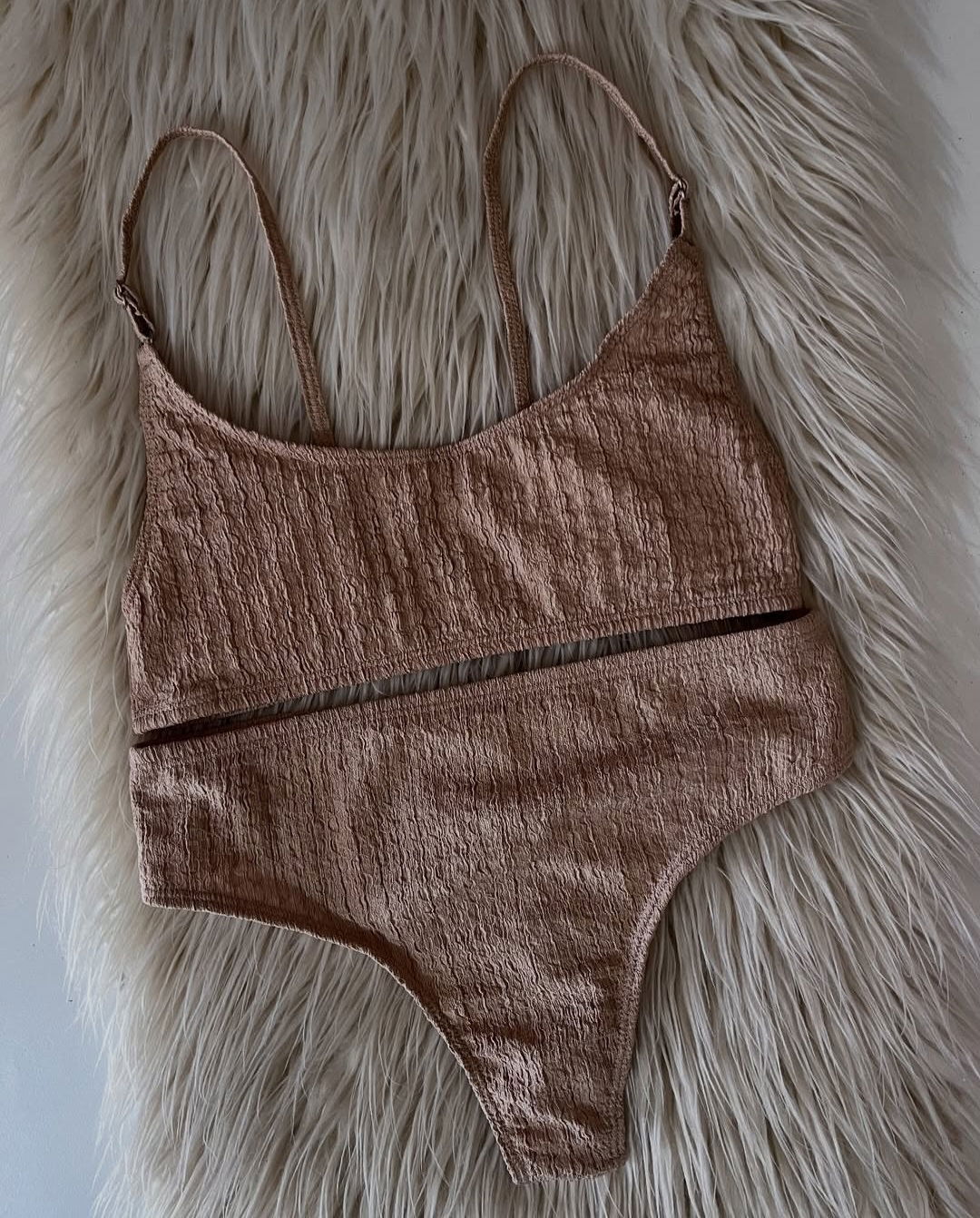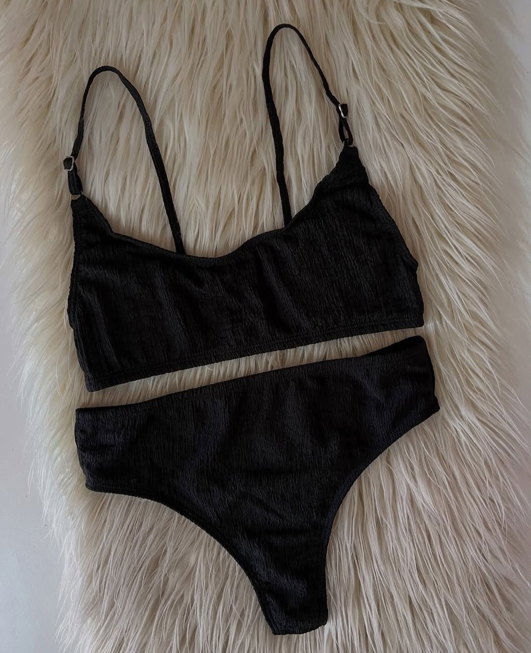Corpiño tipo bando con tiras regulables. Con culotte tiro alto.