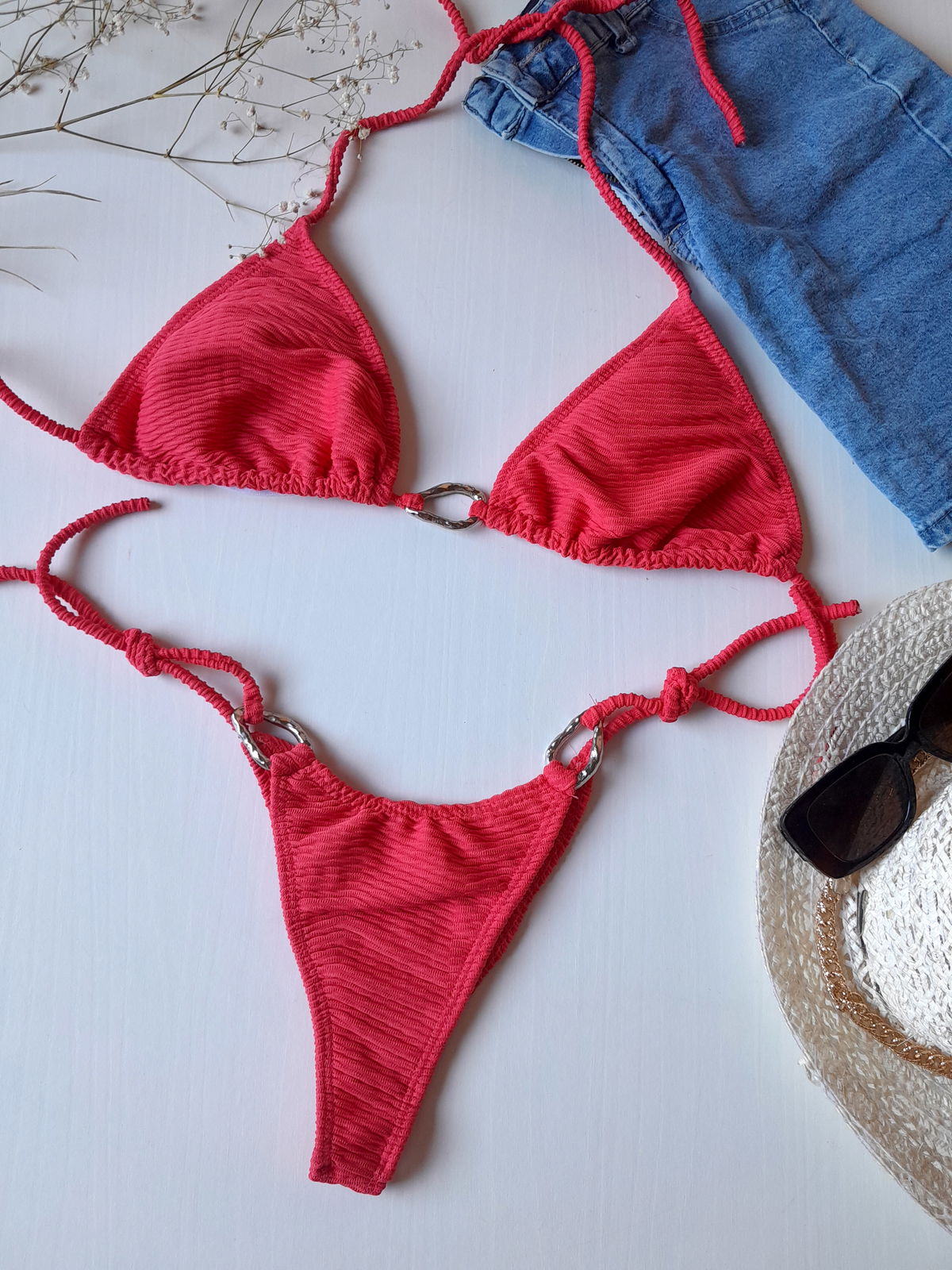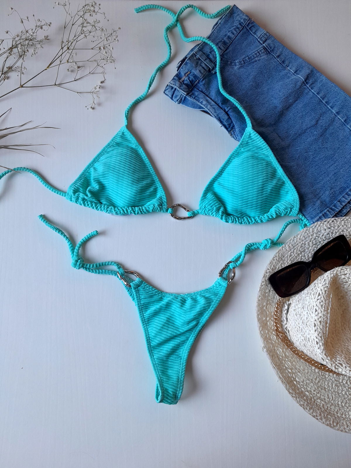 Bikini con apliques irregulares en dorado, tela texturada, forradas por dentro. Con tiras para atar y tazas desmontables.