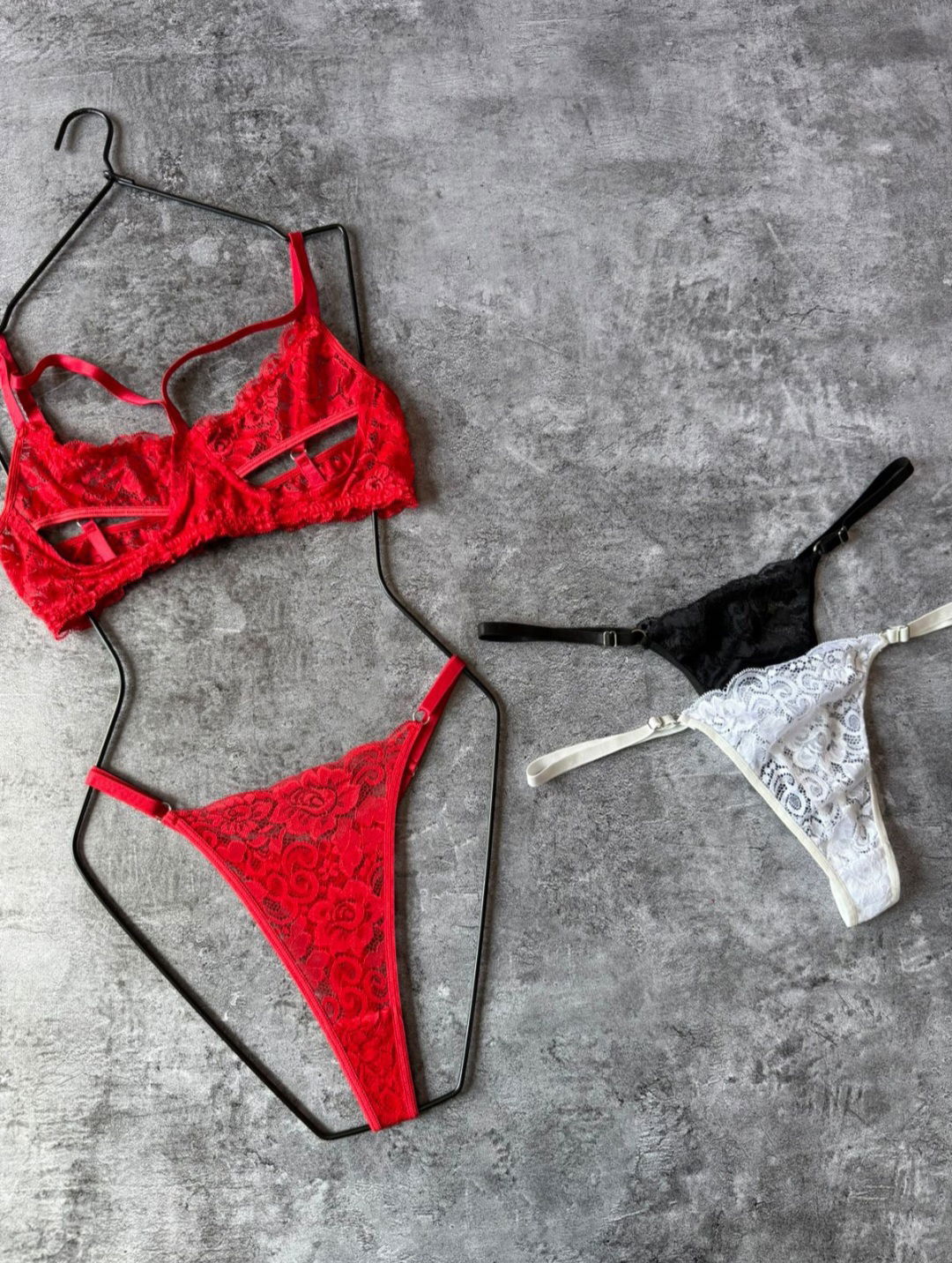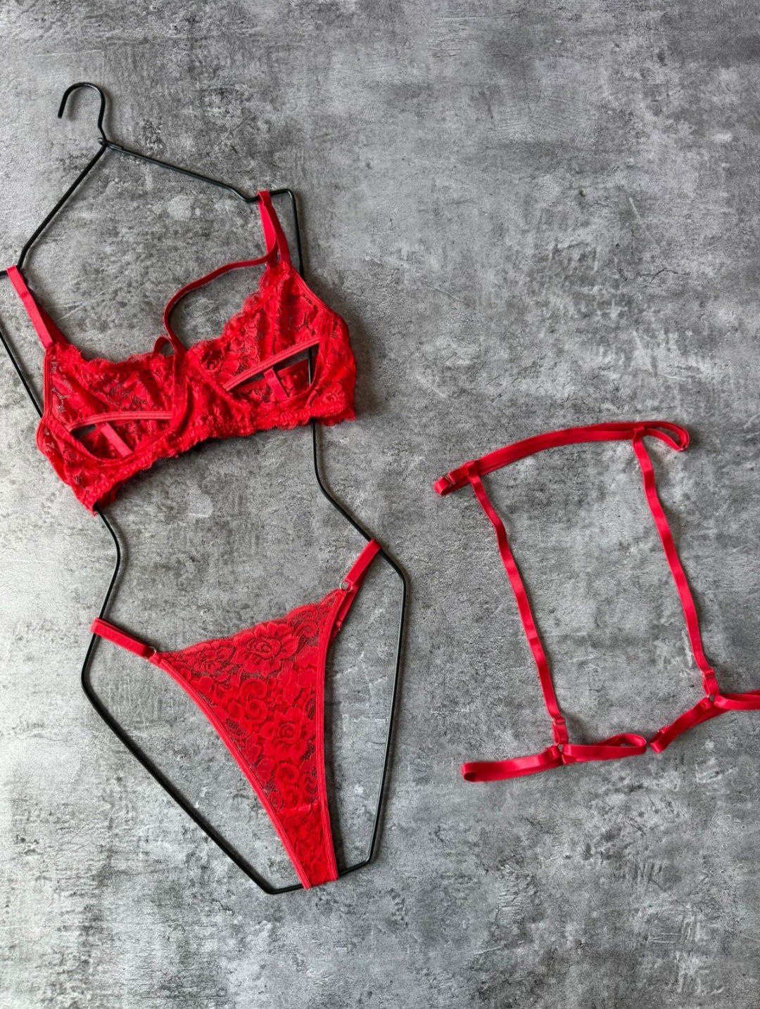 Conjunto de encaje con aro y arnes. Corpiño con abertura.